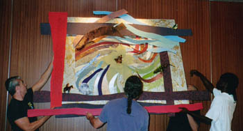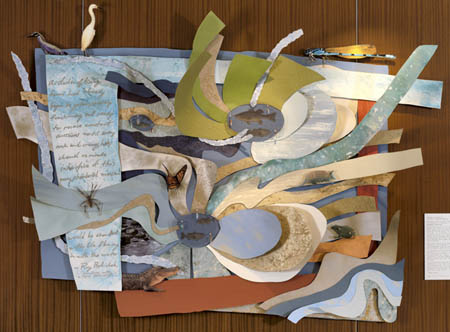 Title: Emergence/A Flower Location: Hyatt Regency Hotel Lobby, Dallas-Fort Worth Airport Size: 8 ft. x 6 ft. Materials: Steel, wood, aluminum, copper, prisms, beads, plexi glass, and paint. When I saw a flower blooming during the Texas heat wave of 1989, I thought, "How can anything grow in this?" Despite the gummy hard clay, cracked earth, and boiling temperatures of a Texas summer, so much manages to grow, create, and thrive in Texas. The rivers, lakes, sea side, ground water, sky, land, trees,hills, and the mountains of Texas are teeming with vitalitylife past and present. The art is an image of the possibility that emerges in nature, in individuals, and in the world of enterprise. It's inspired by flowers that bloom in dry dirt and rocks, by the intricacy of geological layers, by natural ponds that grow in rock formations, the critters that call Texas home, and the uncontainable vitality of Texas and Texans. I found the Roy Bedichek quote long after starting the work and found it to be a perfect companion to the piece. As he proclaims, "It's magic, pure magic, and nothing else." Karen Blessen