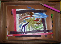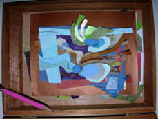 In the next stage, the art was built, in paper, at approximately 1/8 of the final size of the constructions. Then the models were given to the team of fabricators at The Wolf Company in Dallas. They recreated the art at its final size of 8 ft. x 6 ft. x 1/1/2 ft., and in steel, wood, aluminum, copper, prisms, beads, plexi glass, and paint.