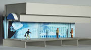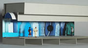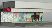 Scale model for finished construction that would have been approx. 50 ft. x 12 ft. This construction was to inhabit the space that is between the parking lot area and the hallway into the airport. Welcome is depicted in six languages, and serves to greet both the arriving and departing passenger. ^ back to top of page |