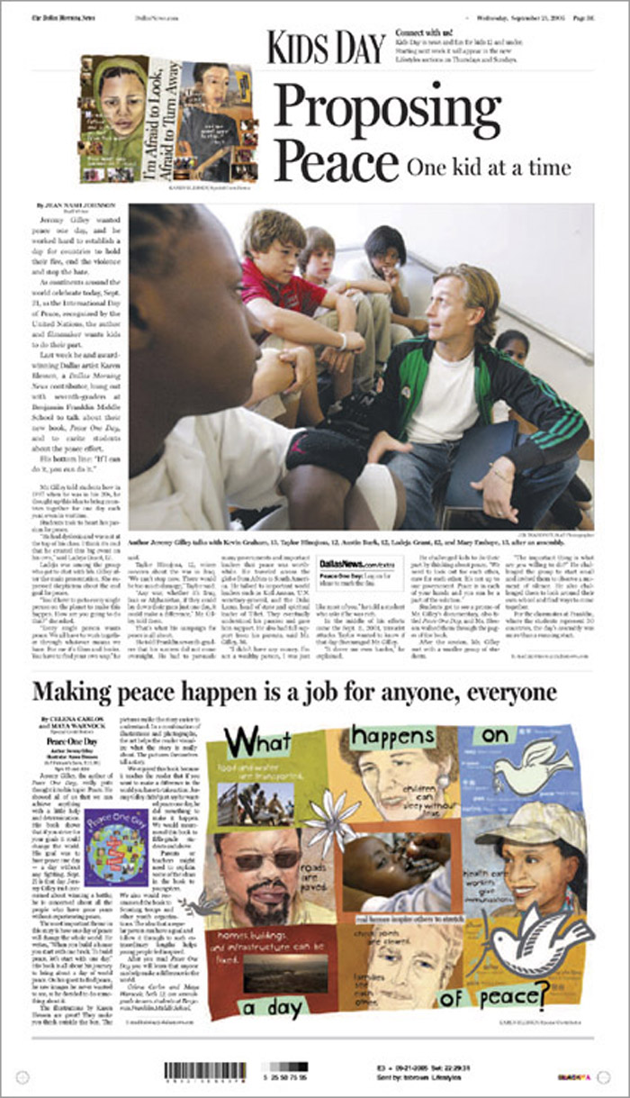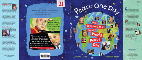 "Peace One Day" is a children's picture book, published in 2005 by G.P. Putnam's Sons, for young readers 8 years old and older. It is the story of British activist and filmmaker Jeremy Gilley's successful quest to have September 21 named as World Peace Day by the United Nations. By telling his story, Jeremy guides young readers into seeing that even though he isjust one person, he persevered and made a difference. And they can too!